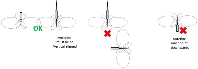 The antennes are vertical polarized and radiate a parabolic RF pattern (see below). Downwards pointing reduces the change that water penetrate into the antenne.