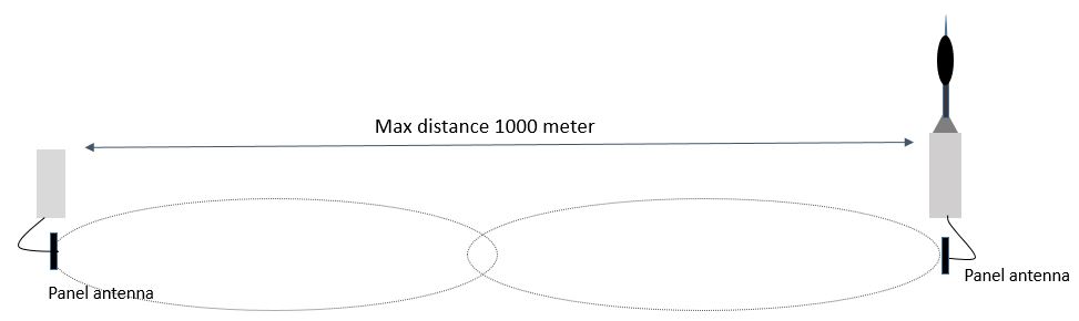 The NMS and gateway are supplied with standard low gain OMNI directional antenna's. This is suitable in most cases and are optimized for mesh networking. But if you know to place of the Gateway and on y have to communicate with one or two NMS stations in the same directions as seen from the gateway, you could consider using directional antennas with an higher gain. It is than perfectly possible to increase the range by two or three fold. An example is shown below.