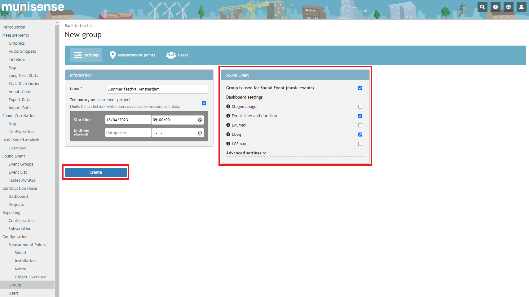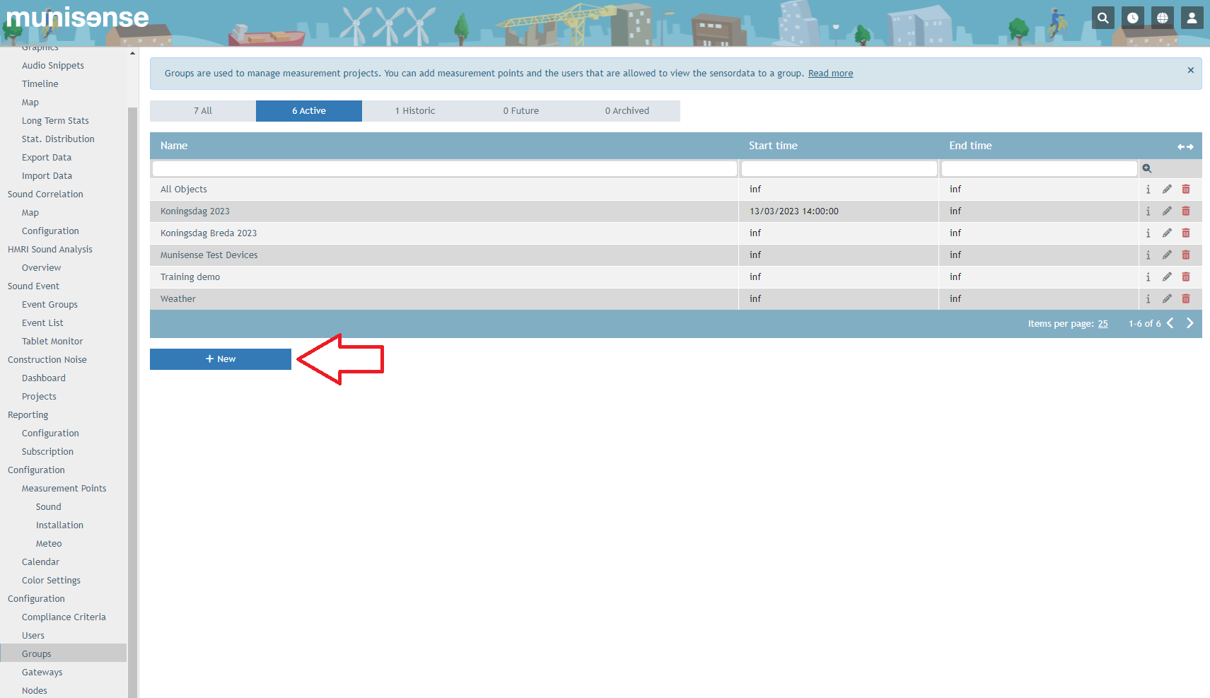 A Sound Event group is a collection of a few things. It can contain users, nodes, gateways, sound measurement points and Sound Events. To create one, go to the Groups page in the portal menu and click the new button.