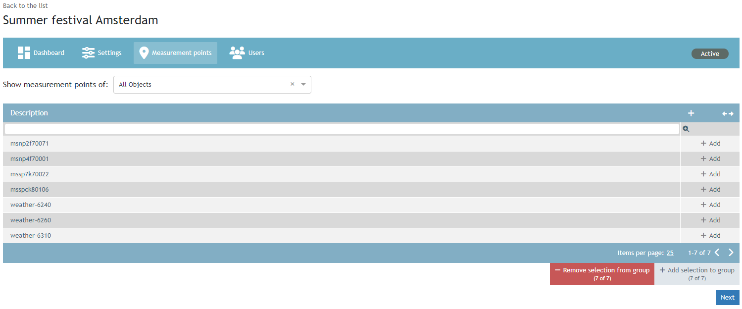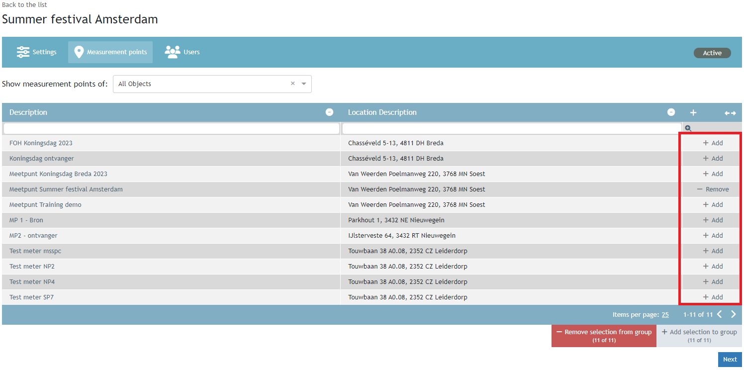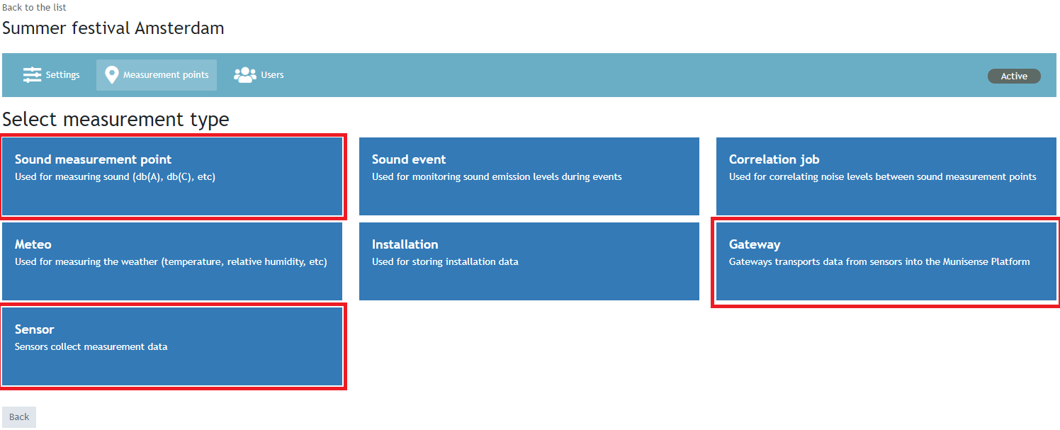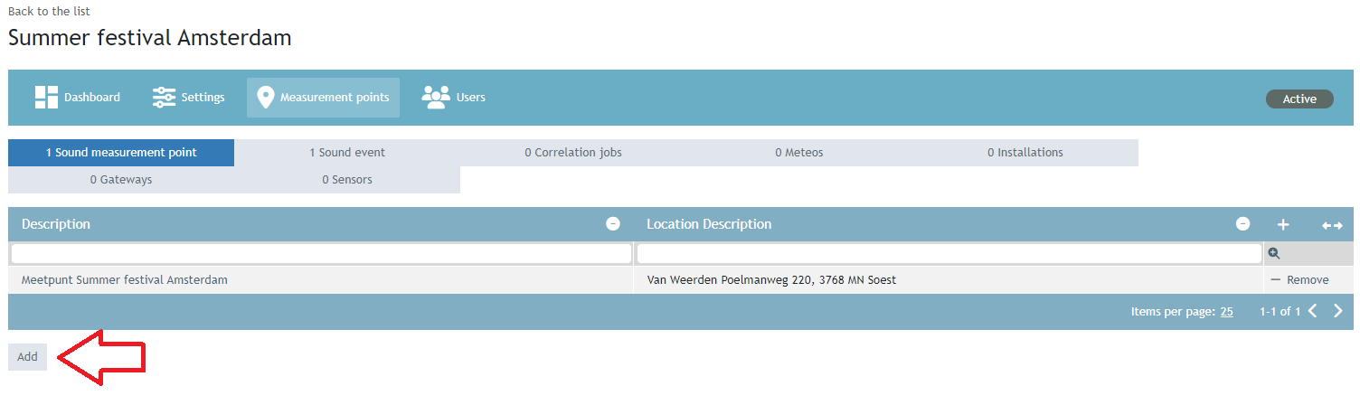 Once you have created a Sound Event group, it is time to add the soundmeter and gateway (sensors) to the group that will be used at the location. Use the measurement points tab to add sensors, gateways and additional measurement points.