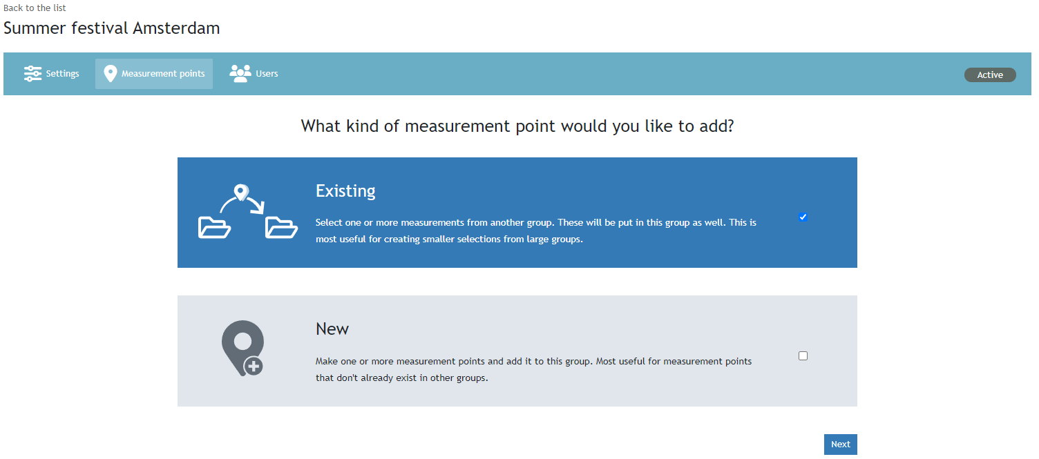 For Sound Event groups a new measurement point will automatically be created if one does not yet exist. This does not happen for groups with existing measurement points. When selecting the option Sound measurement point you will receive the choice for adding additional new or existing measurement points.