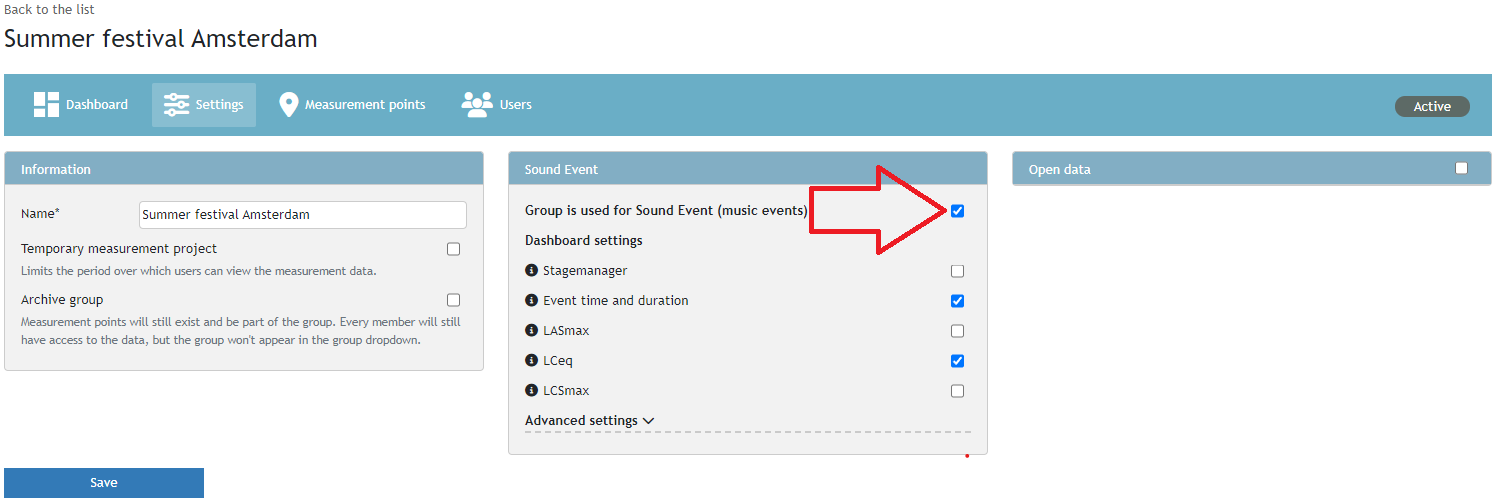 Sound Events are handled differently from other objects in our portal. A Sound Event needs a Sound Event group to properly work and such a group differs from a normal group. In this article we will explain how to create a Sound Event group or upgrade an existing group to a Sound Event group. How to setup the sound event group with a sound meter and gateway. How to couple the sound meter to the sound measurement point. And finally, how to create Sound Events for that display in the portal.