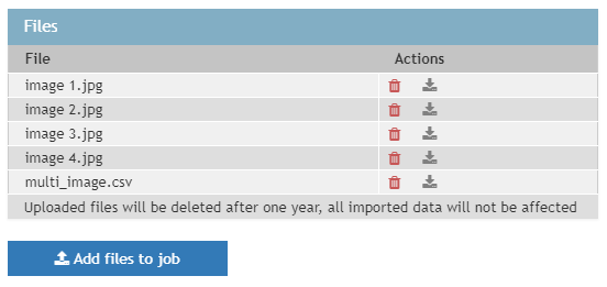 1. Use Add files to job to upload images that are to be attached to measurement points. It is also possible to upload all the images at once by uploading a zip-file that contains all of them.
