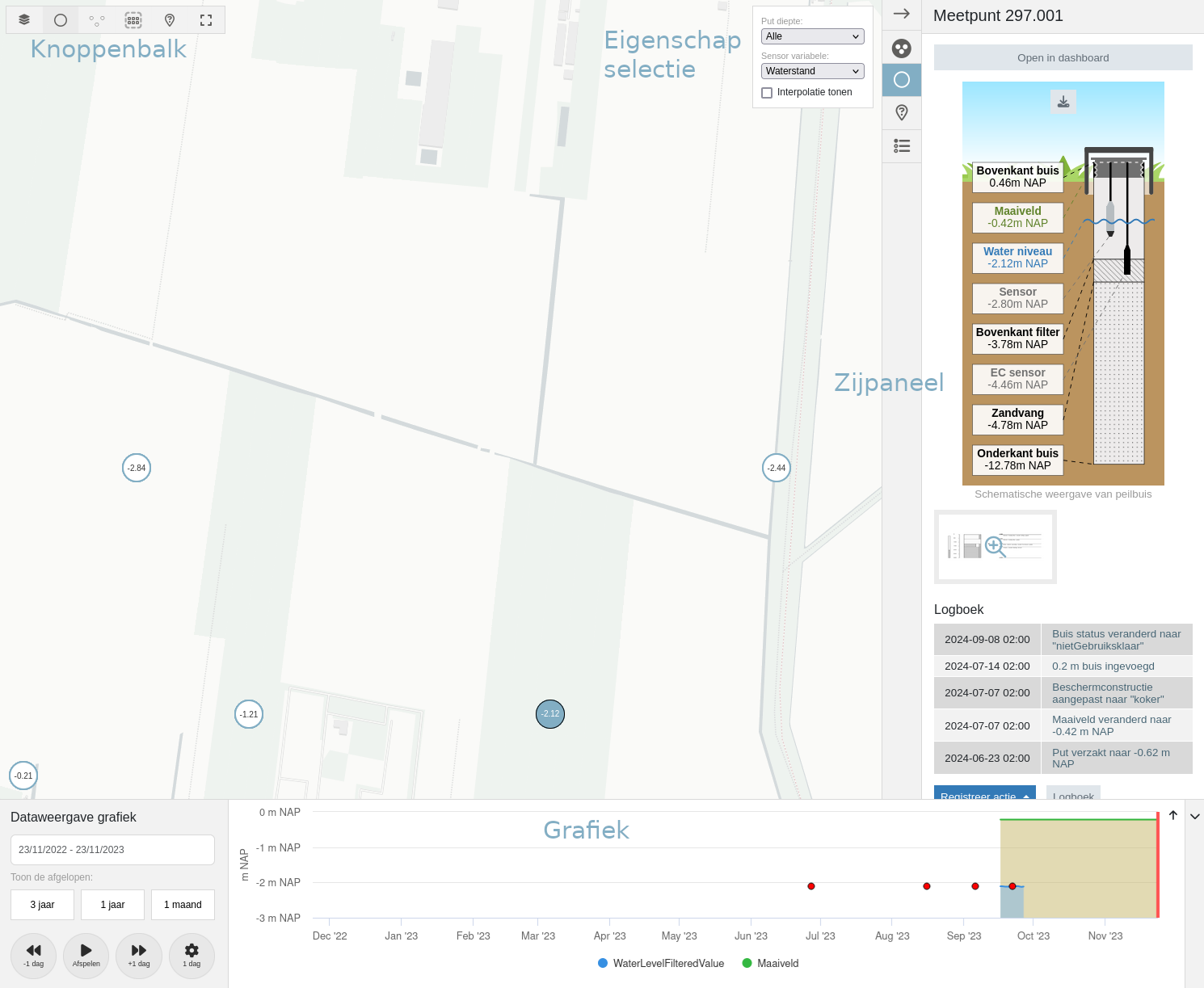 | Meetpunt details: wordt automatisch getoond bij het kiezen van een meetpunt en toont zijn gegevens, zoals de schematische weergave en het logboek. | |