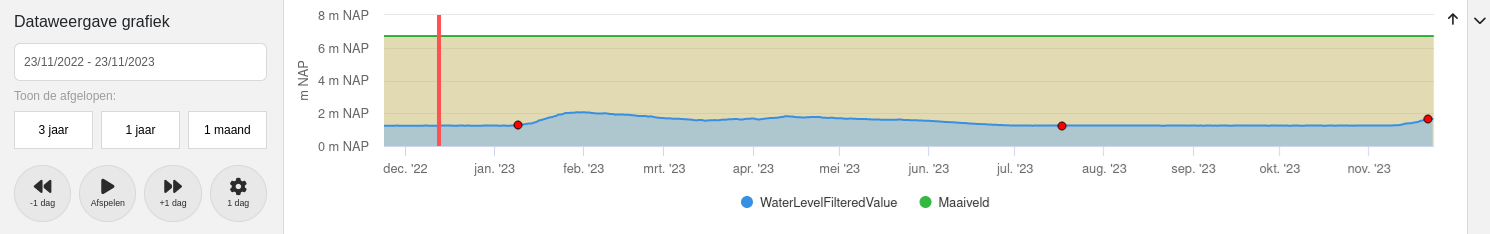 Het is mogelijk om in stappen van 1 dag/week/maand door de grafiek te lopen. Hierbij passen de getoonde meetpunten op de kaart zich aan zodat de verandering in waterniveau over tijd te zien is. Verplaats de verticale rode lijn naar de plaats waar afspelen moet beginnen en druk op de "Afspelen"-knop.